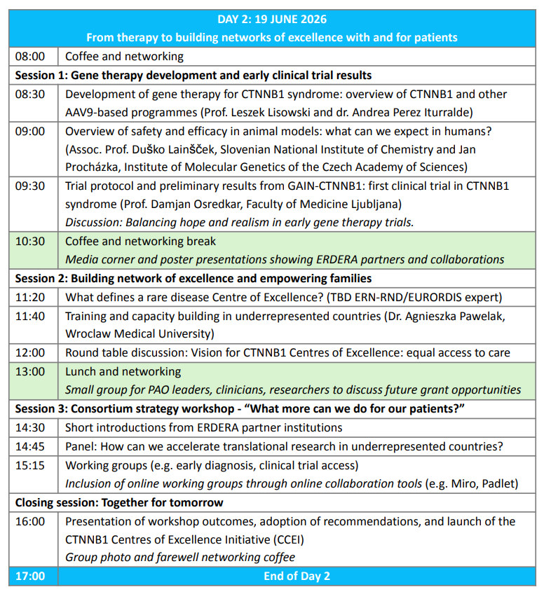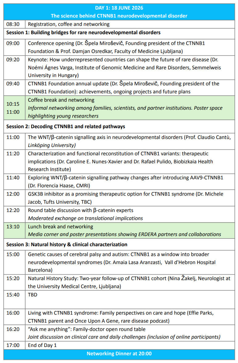 As many key topics have already been covered in previous years, this year’s focus will be on sharing the first preliminary insights from the gene therapy clinical trial and the ongoing natural history study, alongside presenting a vision for building global Centers of Excellence. These centres aim to consolidate expertise on CTNNB1 syndrome and to support the establishment of new clinical trial sites worldwide.