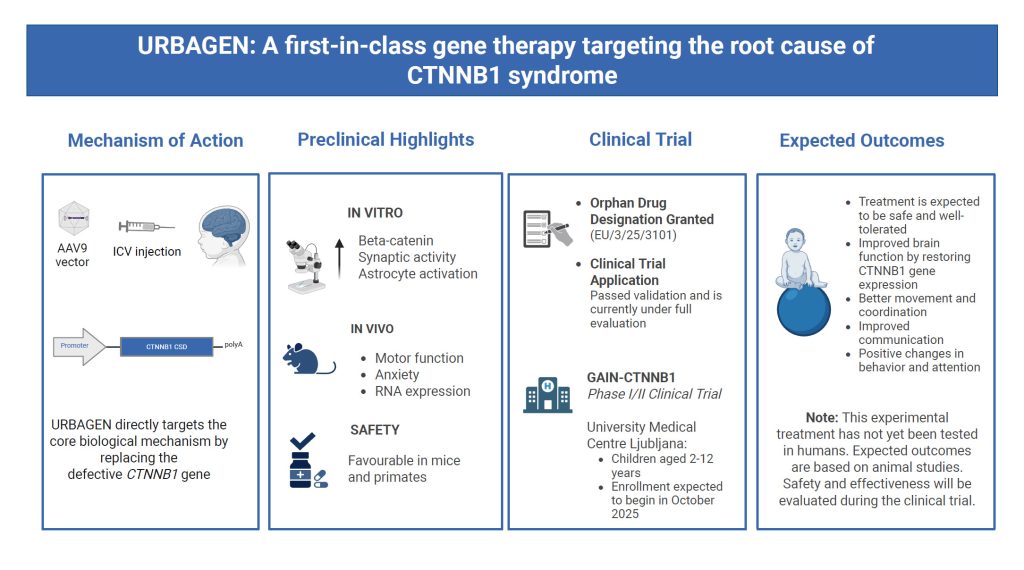 URBAGEN is being developed to be a single-dose intracerebroventricular injection of non-replicating, single-stranded AAV9 vector for loss-of-function variants in the CTNNB1 syndrome.